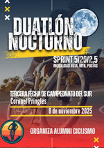 (01/09/2025) Los tresarroyenses se impusieron con autoridad en la segunda fecha del Campeonato de Duatlon del Sur llevado a cabo en Copetonas de la mano del Instituto Segundario Almafuerte. Entre las MTB ganaron Francisco Spina de Estancia San Javier y Marianela Taboada de Tres Arroyos.
